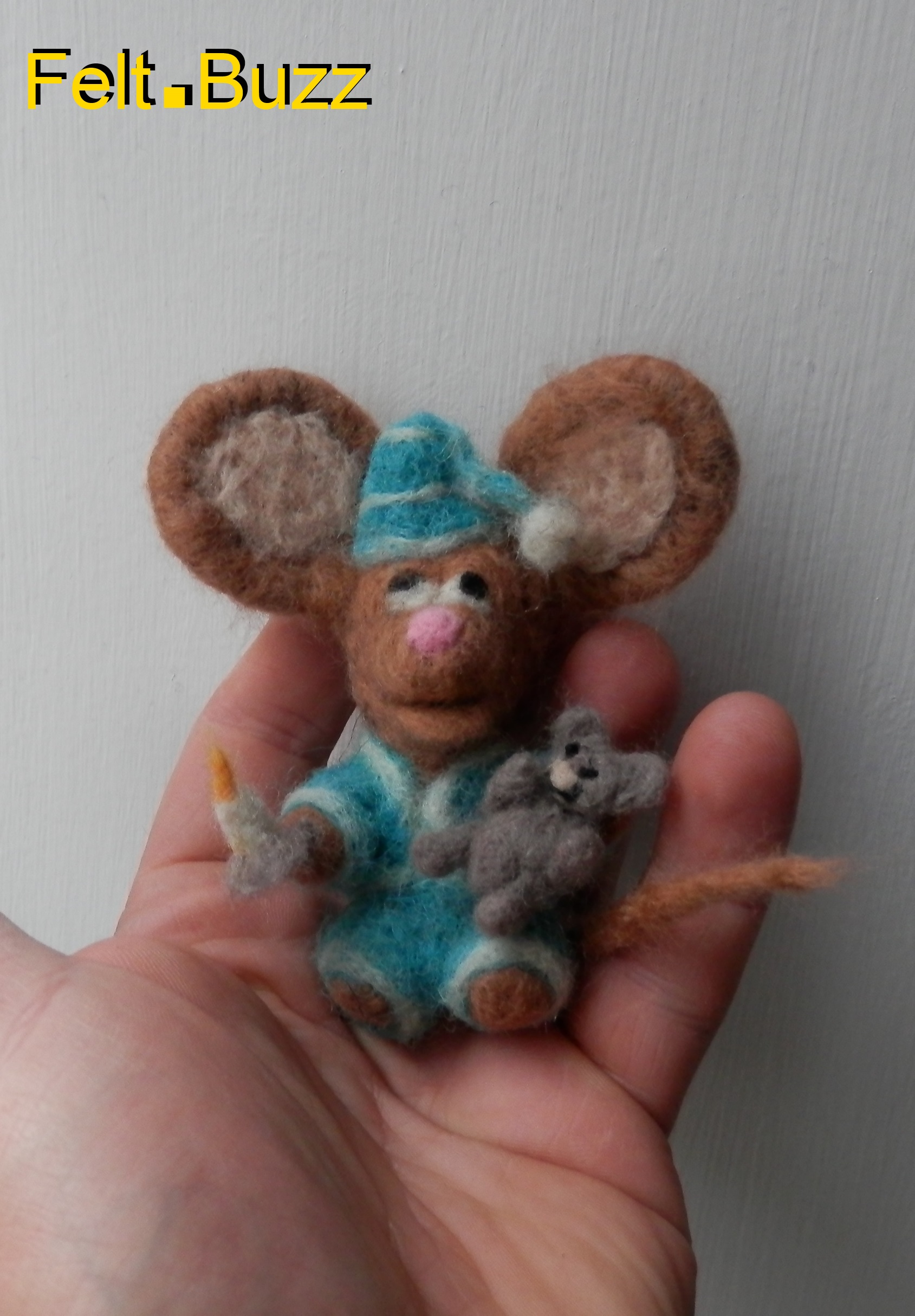 Evening all! How is your Sunday going? We have had a lovely walk (overcast, but no rain), and are now waiting for some guests to arrive. I made this little sleepy mouse today: he’s in his pyjamas, has a teddy, a candle and a night cap too. All 100% wool (needle felted).