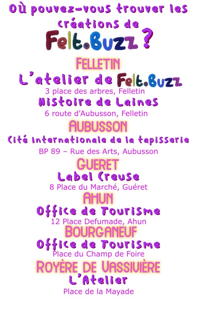Vous pouvez trouver les créations de Felt.Buzz dans la boutique Label Creuse, Guéret, la boutique de la cité internationale de la tapisserie, Aubusson, Histoire de la Laines, Felletin, la boutique de L’Atelier, Royère de Vassiviere, les offices de tourisme de Ahun et Bourganeuf et biensûr dans l’atelier de Felt.Buzz, Felletin