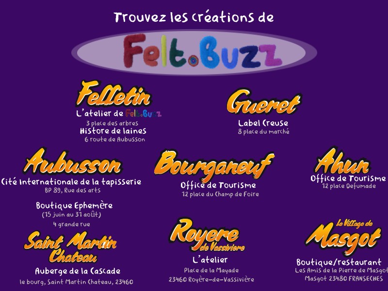 Vous pouvez trouver les créations de Felt.Buzz dans la boutique Label Creuse, 8 place du marché, Guéret, la boutique de la cité internationale de la tapisserie, BP 89, Rue des arts, Aubusson, Histoire de la Laines, 6 route de Aubusson, Felletin, la boutique de L’Atelier, place de la Mayade, Royère de Vassiviere, les offices de tourisme de Ahun (12 place Defumade) et Bourganeuf (12 place de champ de Foire), la boutique dans le village de Masgot, la boutique de l’Auberge de la Cascade, le bourg, Saint Martin Château et biensûr dans l’atelier de Felt.Buzz, 3 place des arbres, Felletin