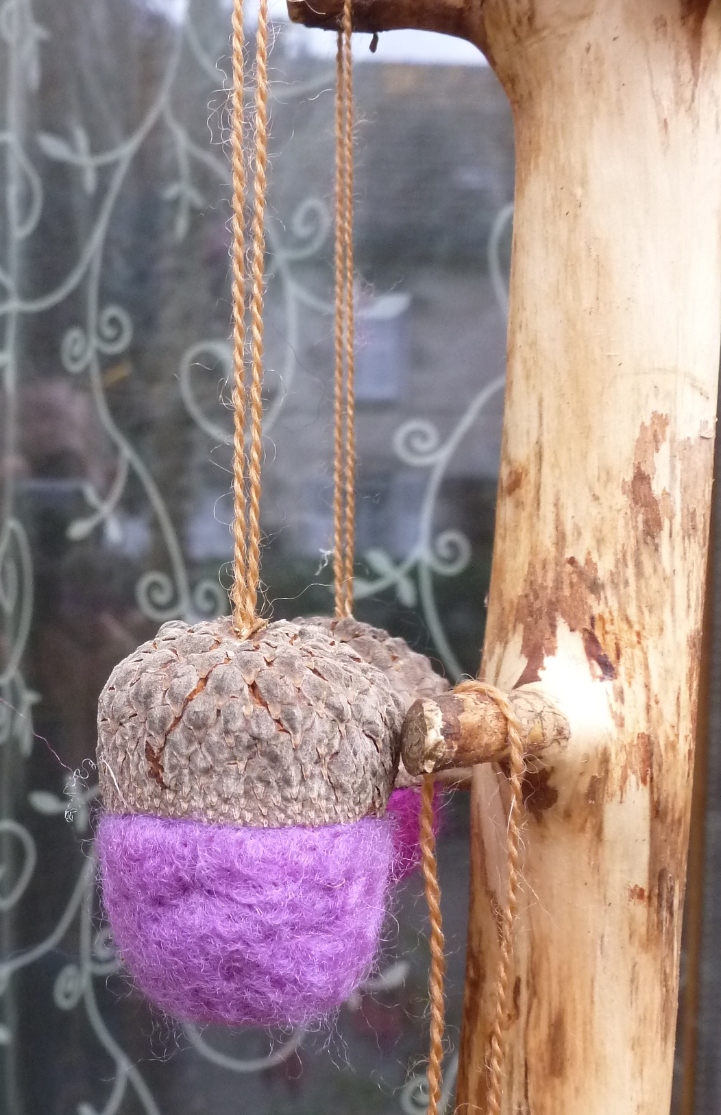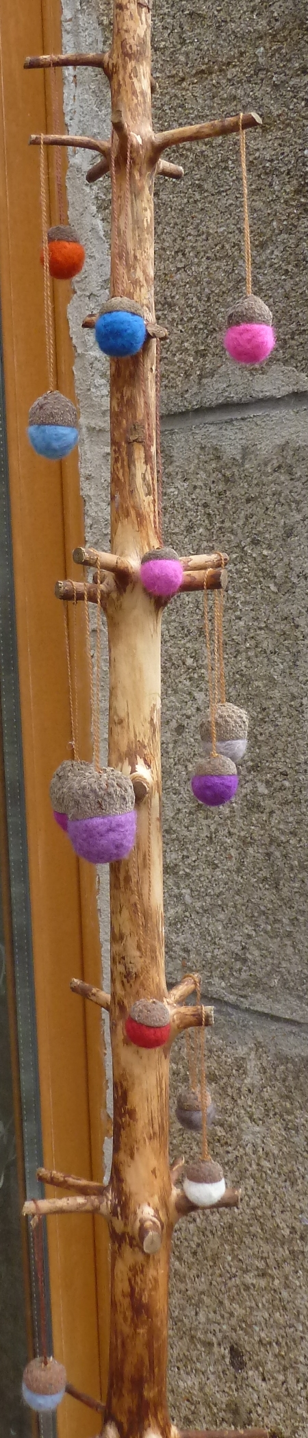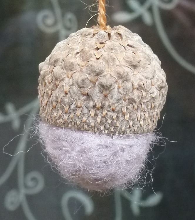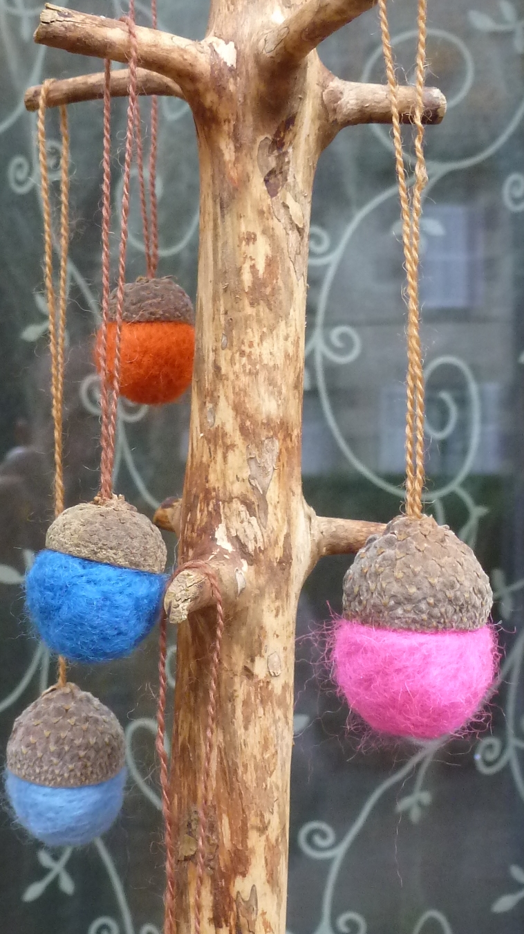 I have attached needle-felted balls onto real acorn caps to create these lovely decorations. (They are displayed on part of an old Christmas tree that was left outside for a couple of years, the bark came off nice and easily and it looks pretty good, I think).