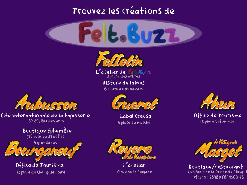 Vous pouvez trouver les créations de Felt.Buzz dans la boutique Label Creuse, 8 place du marché, Guéret, la boutique de la cité internationale de la tapisserie, BP 89, Rue des arts, Aubusson, Histoire de la Laines, 6 route de Aubusson, Felletin, la boutique de L’Atelier, place de la Mayade, Royère de Vassiviere, les offices de tourisme de Ahun (12 place Defumade) et Bourganeuf (12 place de champ de Foire), la boutique dans le village de Masgot et biensûr dans l’atelier de Felt.Buzz, 3 place des arbres, Felletin