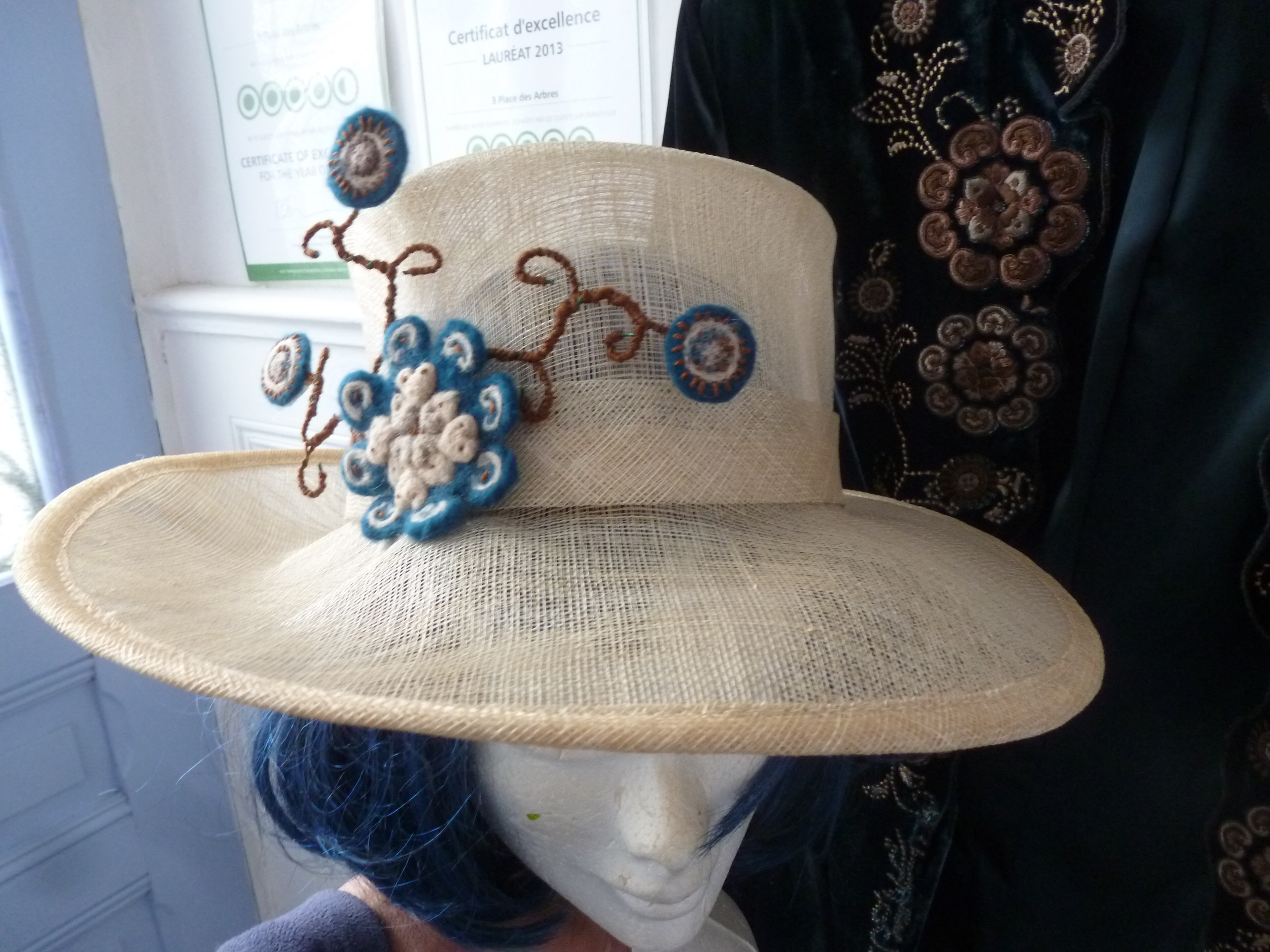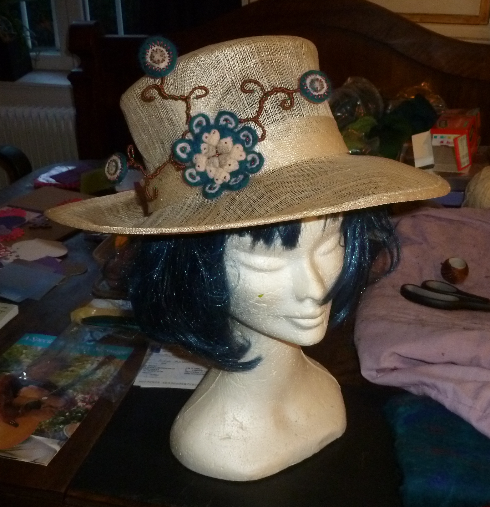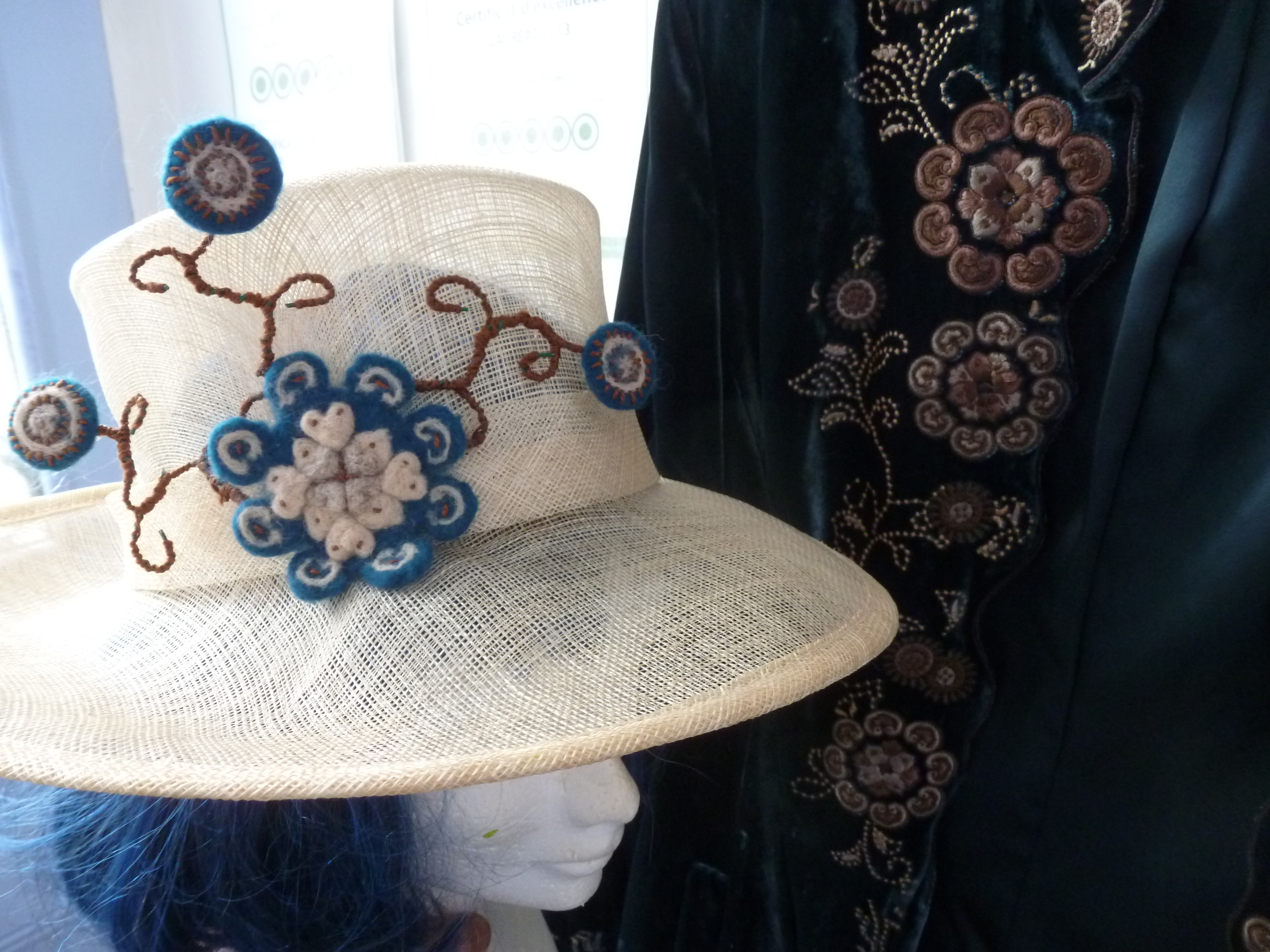 For a wedding, I was asked to create a decoration for a hat. I used the decoration on the coat that was to be worn, as inspiration.